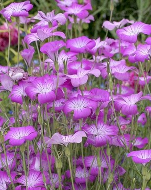 Annuelle champêtre, frugale. Fleurs en entonnoir, rose fuchsia veiné de pourpre au sommet de hautes tiges sinueuses et velues. Très facile de culture.