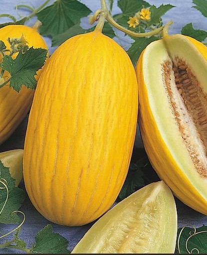 hâtif de type espagnol, de 1,2 à 1,5 kg, un peu côtelé, ovale comme un ballon de rugby, chair blanche, croquante, parfumée, saveur fine, semences reproductibles.