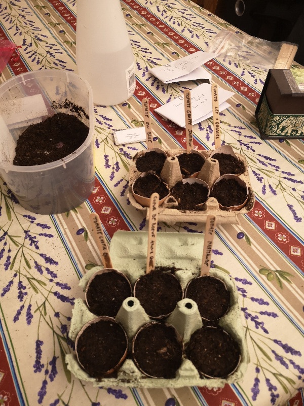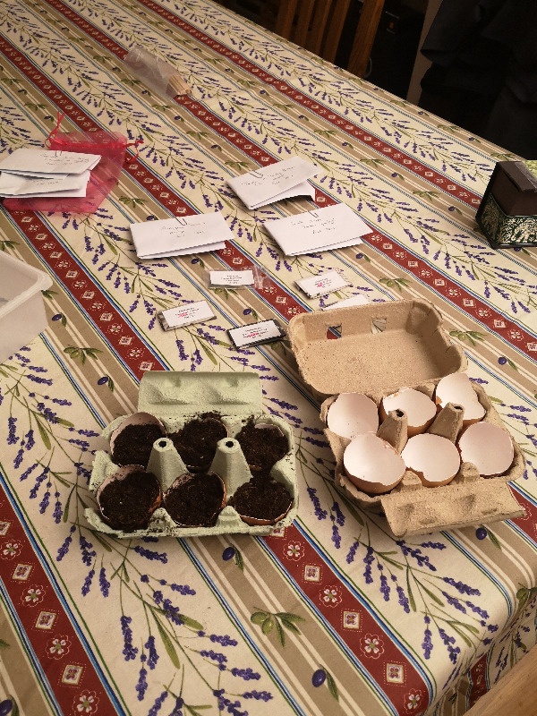 allez, ce soir, j'ai réussi à me garder un peu de temps (en confinement entre les devoirs a la maison des enfants et le télétravail) pour lancer les semis... Je teste les coquilles d'œufs dont on a parlé à l'atelier hybridation pour les tomates. Pas facile de retirer la membrane, je n'ai pas fait non plus de trous dans la coquille, je vais essayer de ne pas inonder mes précieuses graines.