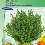 Ce vrai thym d'été à fleurs mauves ou roses, parfois blanches, fleurit les années suivantes en mai et juin. Le thym à un effet réconfortant, il est très aromatique et aide à digérer les aliments. Les feuilles et les tiges peuvent mijoter dans les plats de viande et cuire avec les légumes lourds. Séché, le thym garde son arôme fort. Il apprécie les endroits ensoleillés, secs et calcaires. Le thym d'été est sensible au gel, le couvrir éventuellement en hiver.